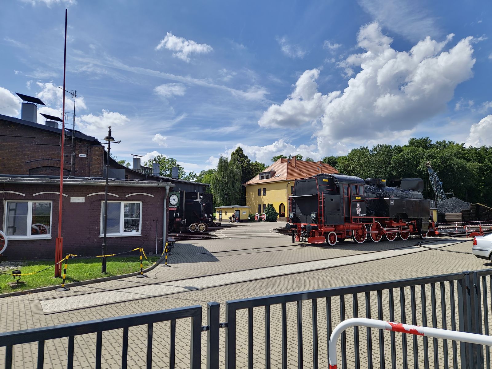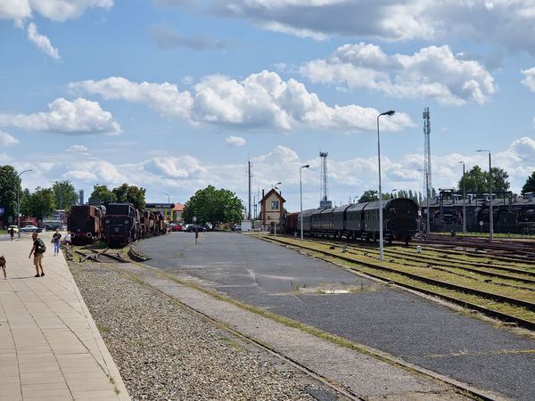 Kierujemy się wzdłuż torów kolejowych. Trzymając się prawej strony, mijamy stojące na bocznicy parowozy.
