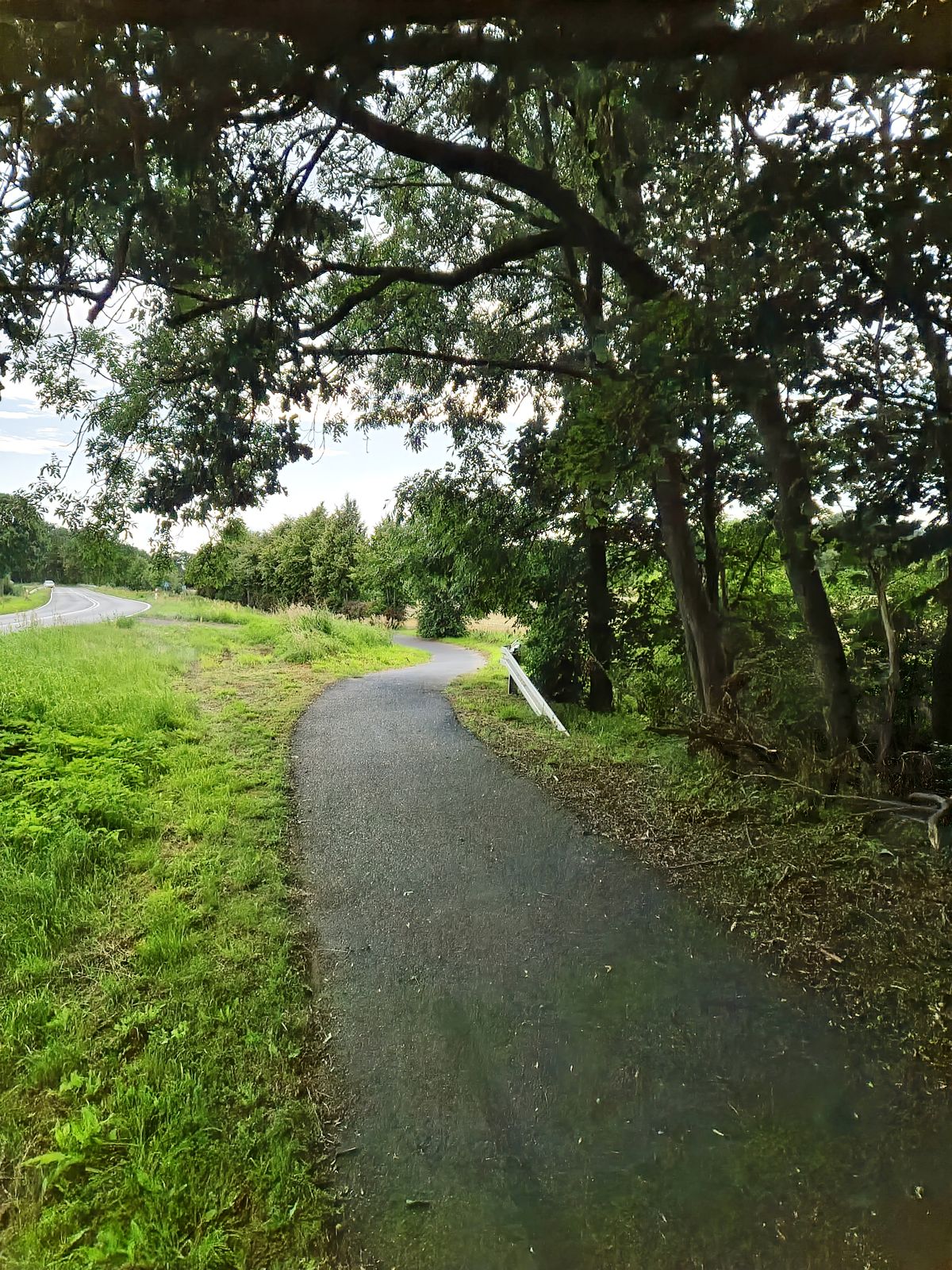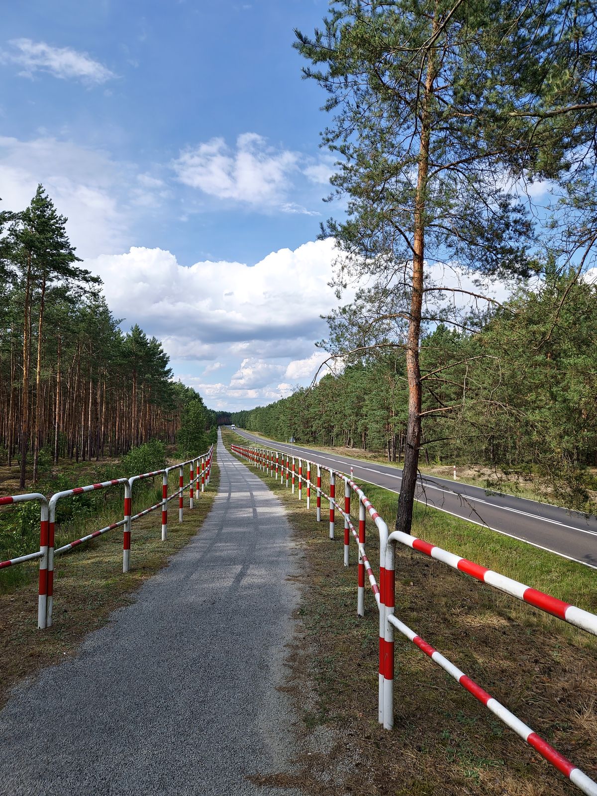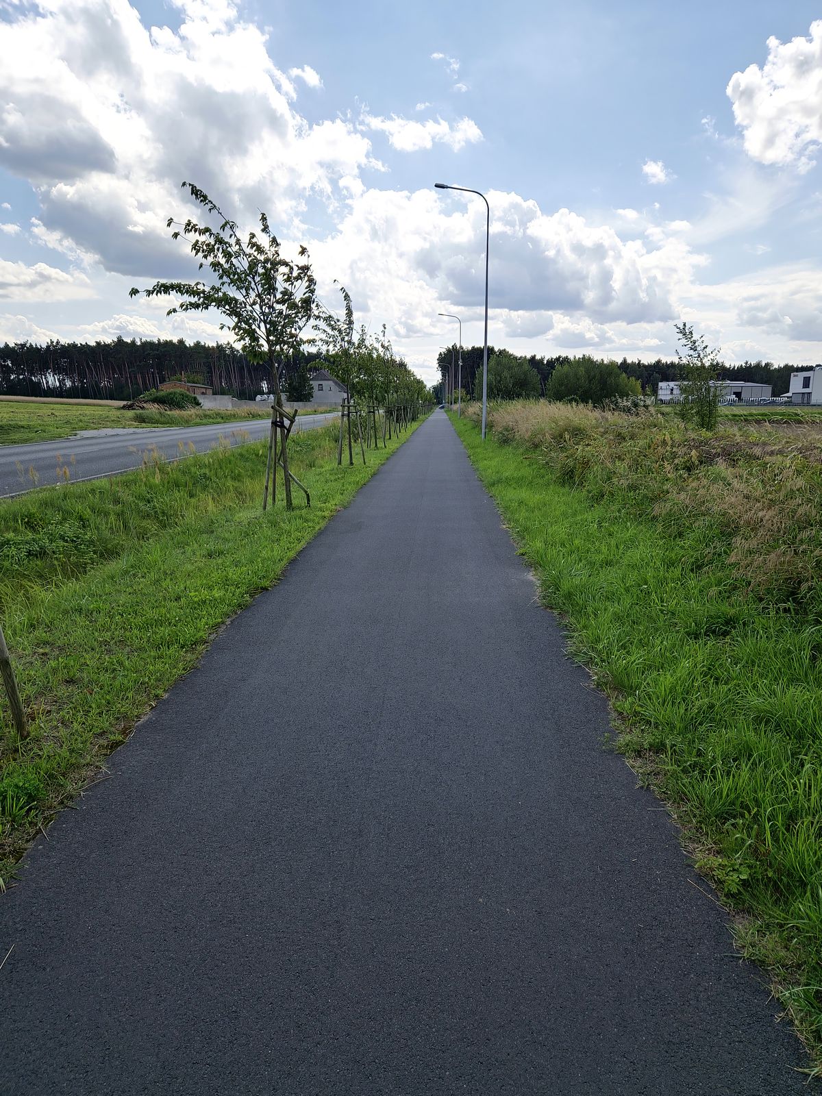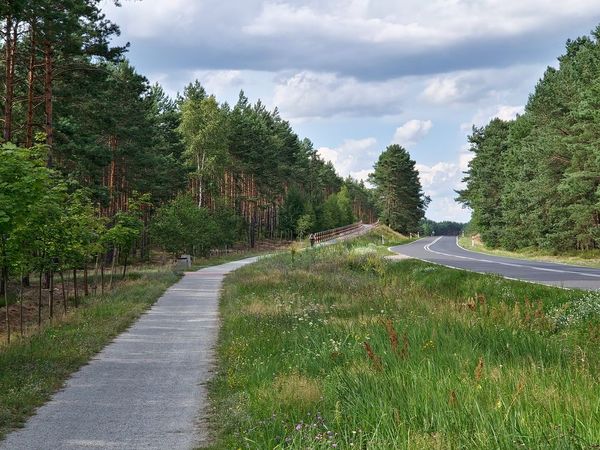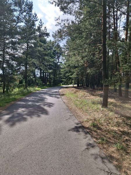Dalej podążamy drogą asfaltową, by po ok. 500 m wjechać na szutrową ścieżkę rowerową kryjącą się za drzewami po prawej stronie drogi.