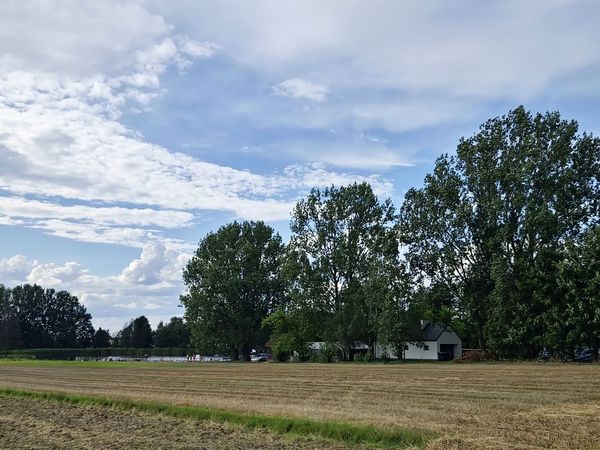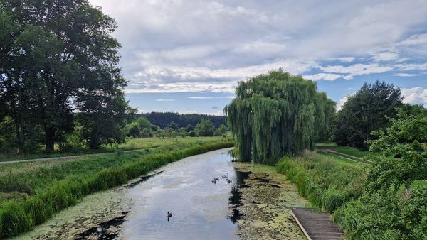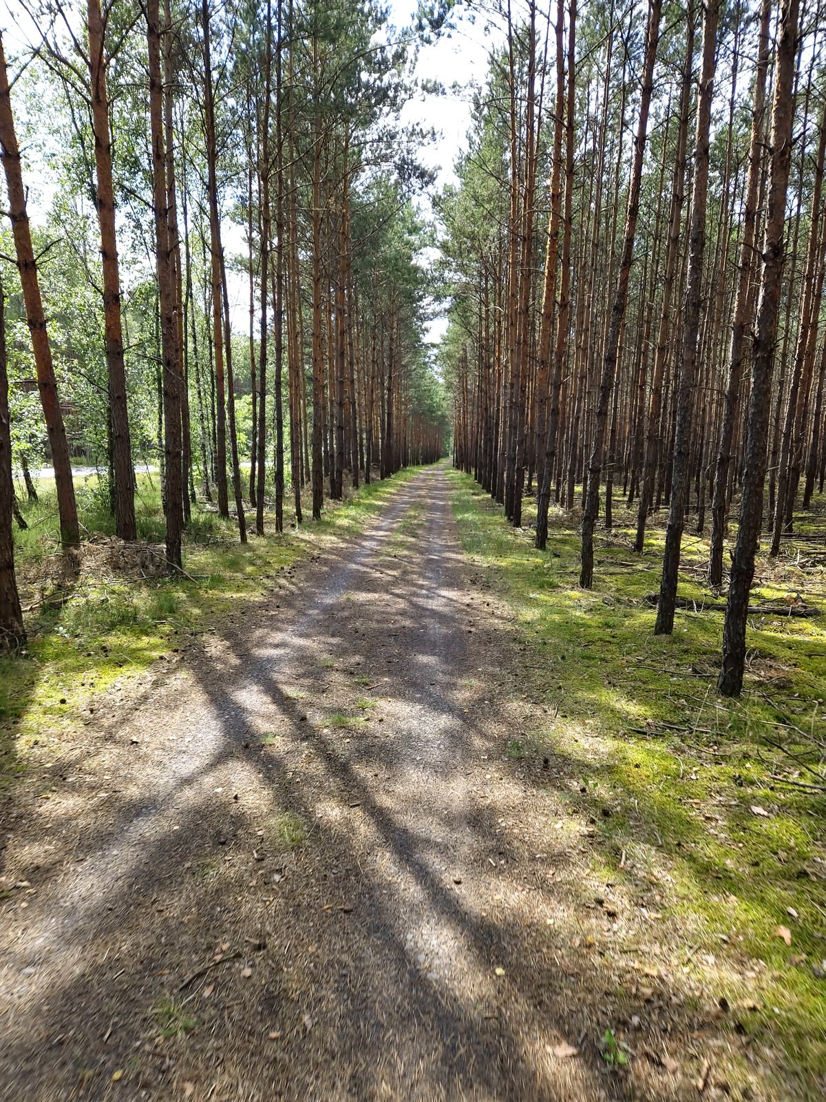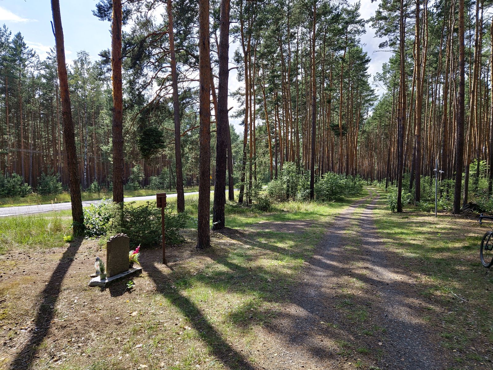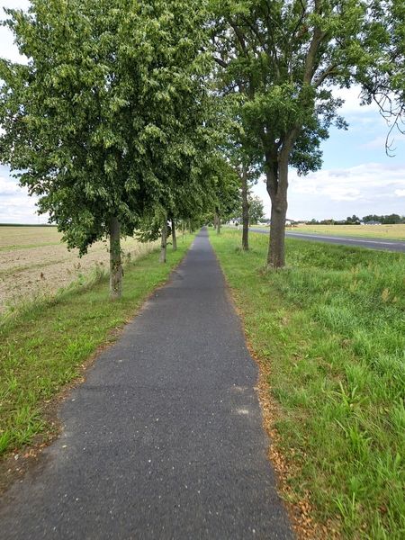 Dalej podążamy drogą asfaltową, by po ok. 500 m wjechać na szutrową ścieżkę rowerową kryjącą się za drzewami po prawej stronie drogi.