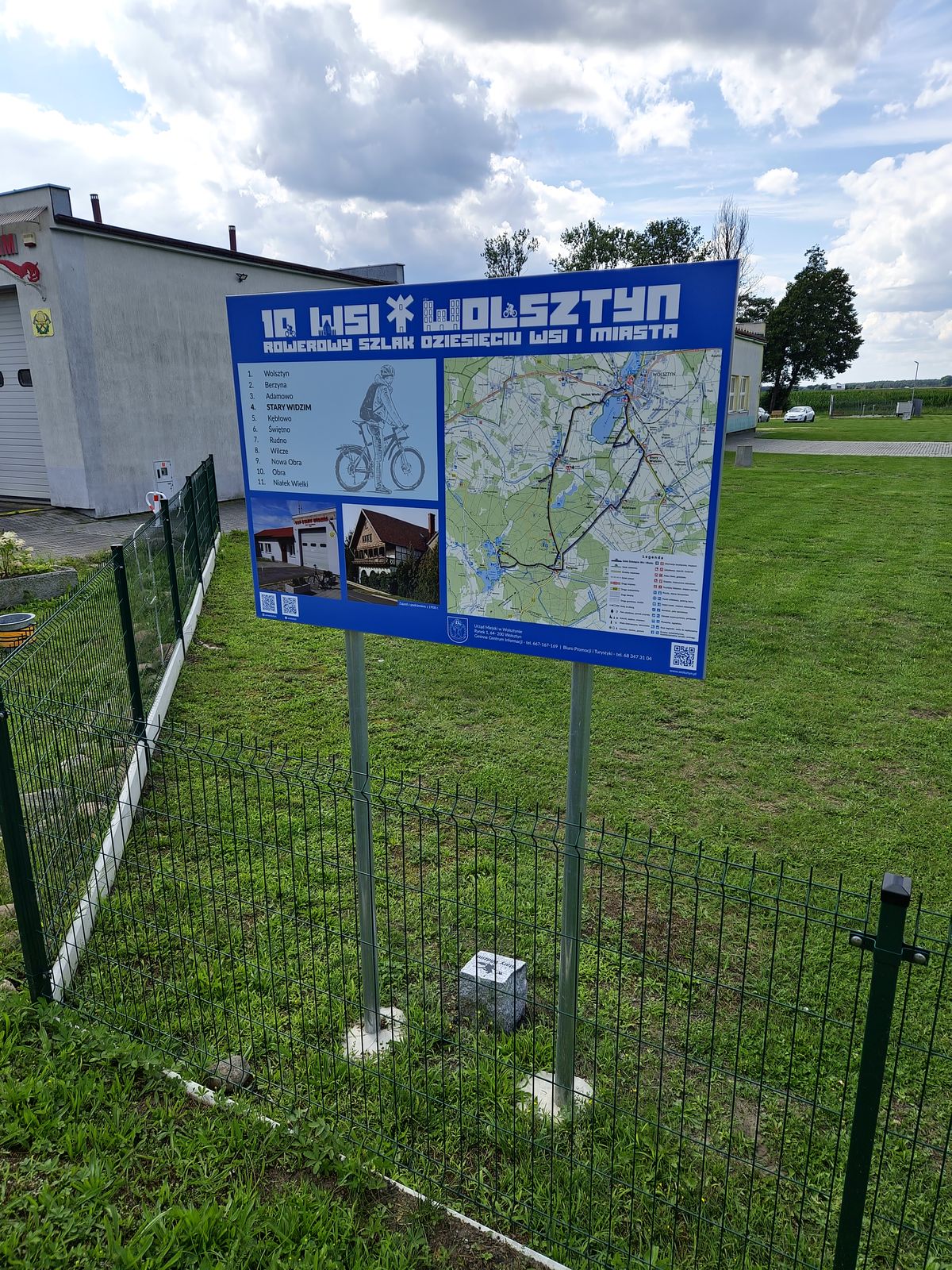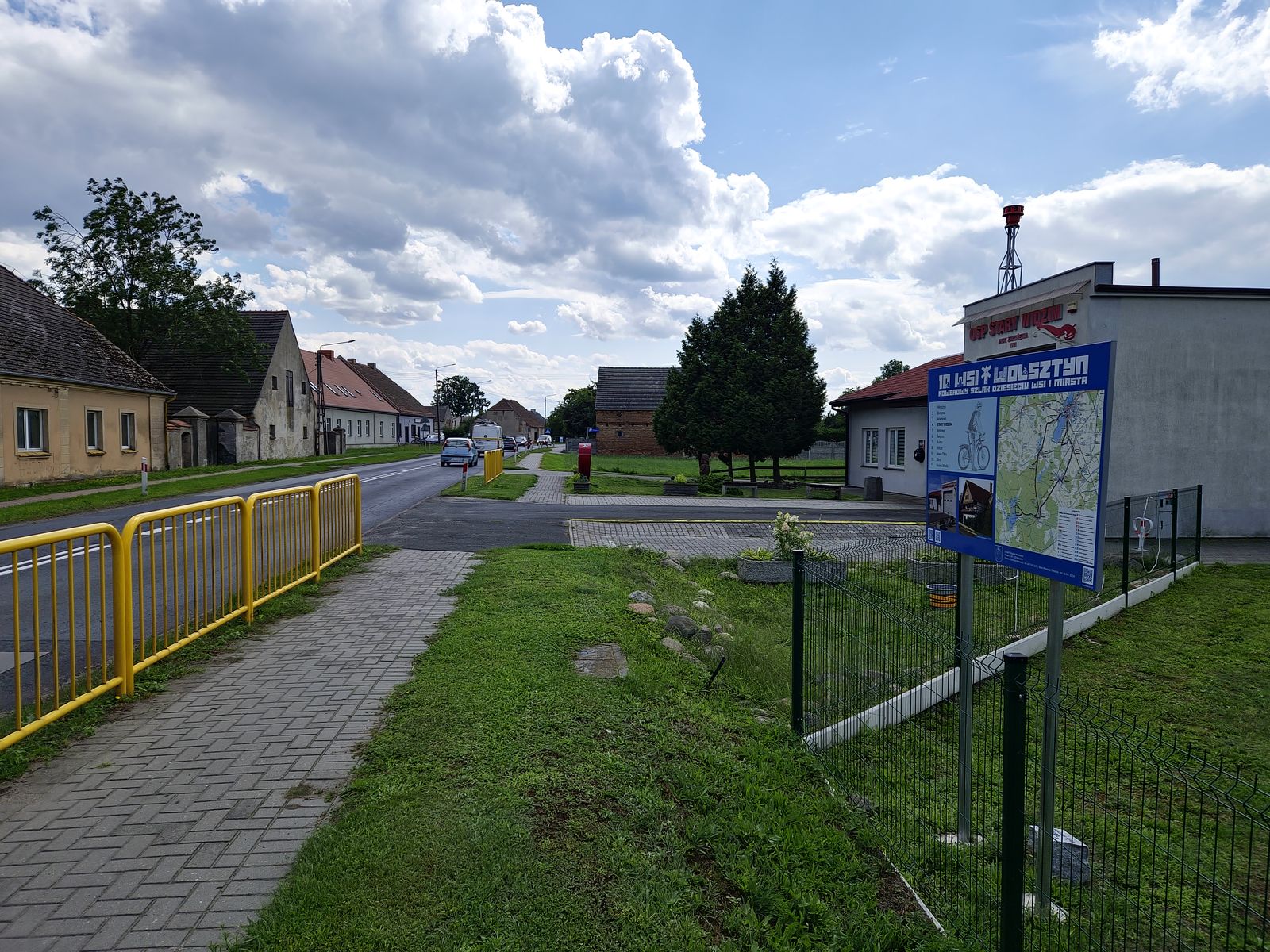 Podążamy dalej ścieżką rowerową przez Stary Widzim. Ścieżka początkowo biegnie po prawej stronie drogi, koło placu zabaw przechodzi na lewą stronę i na światłach znów wraca na prawą. Tuż za światłami natkniemy się na kolejną tablicę, stojącą przed remizą OSP oraz słupek przedstawiający Wiedźmę, nawiązującą do tajemniczej nazwy miejscowości Widzim. To symbol z przymrużeniem oka, który łączy regionalną tożsamość z nutą legendy i humoru.