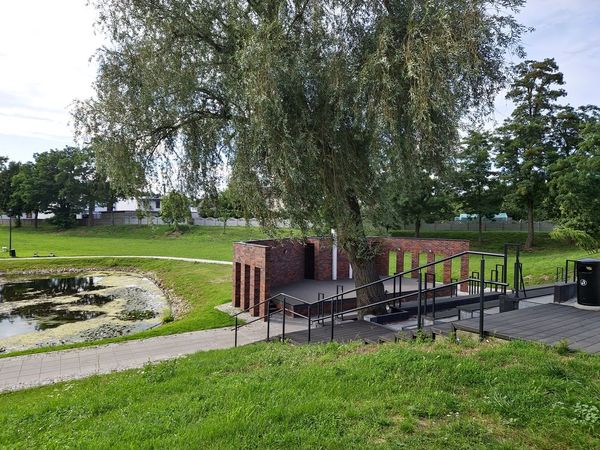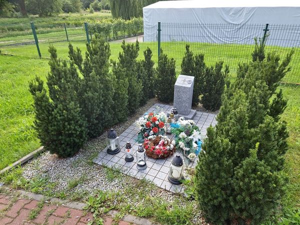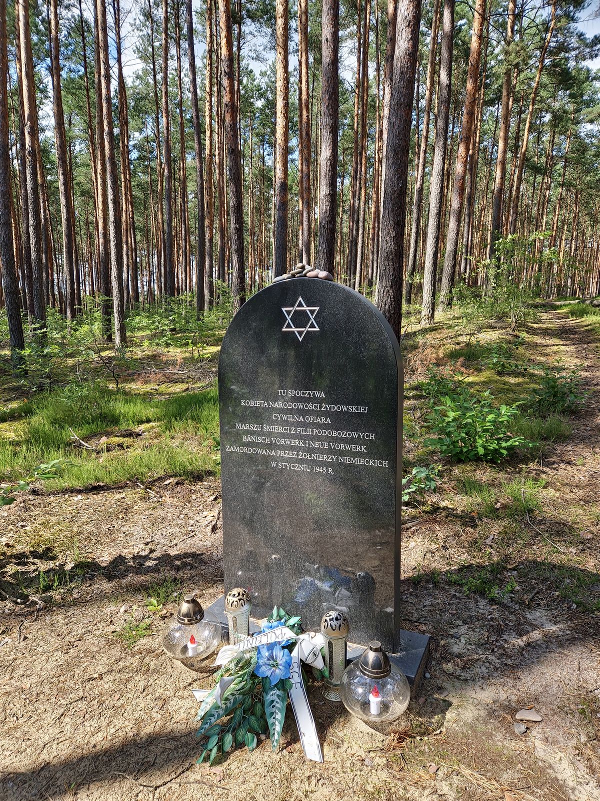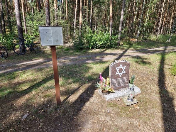 Jadąc ścieżką mijamy symboliczny nagrobek upamiętniający kobietę narodowości żydowskiej, zmarłą w styczniu 1945 r. podczas Marszu Śmierci, do którego niemiecki okupant zmusił niemal 2000 więźniarek z obozów pracy w Potrzebowie koło Sławy.