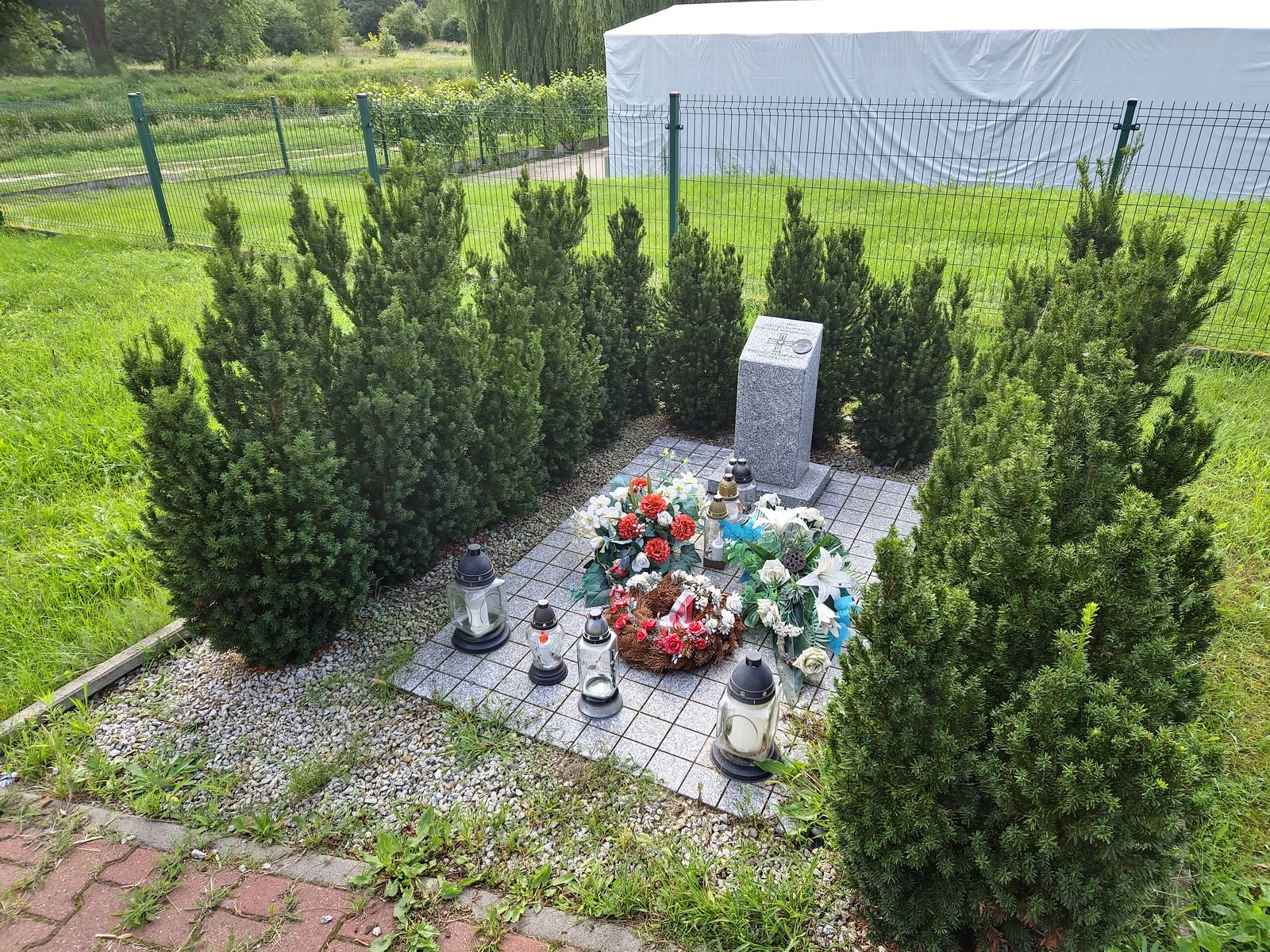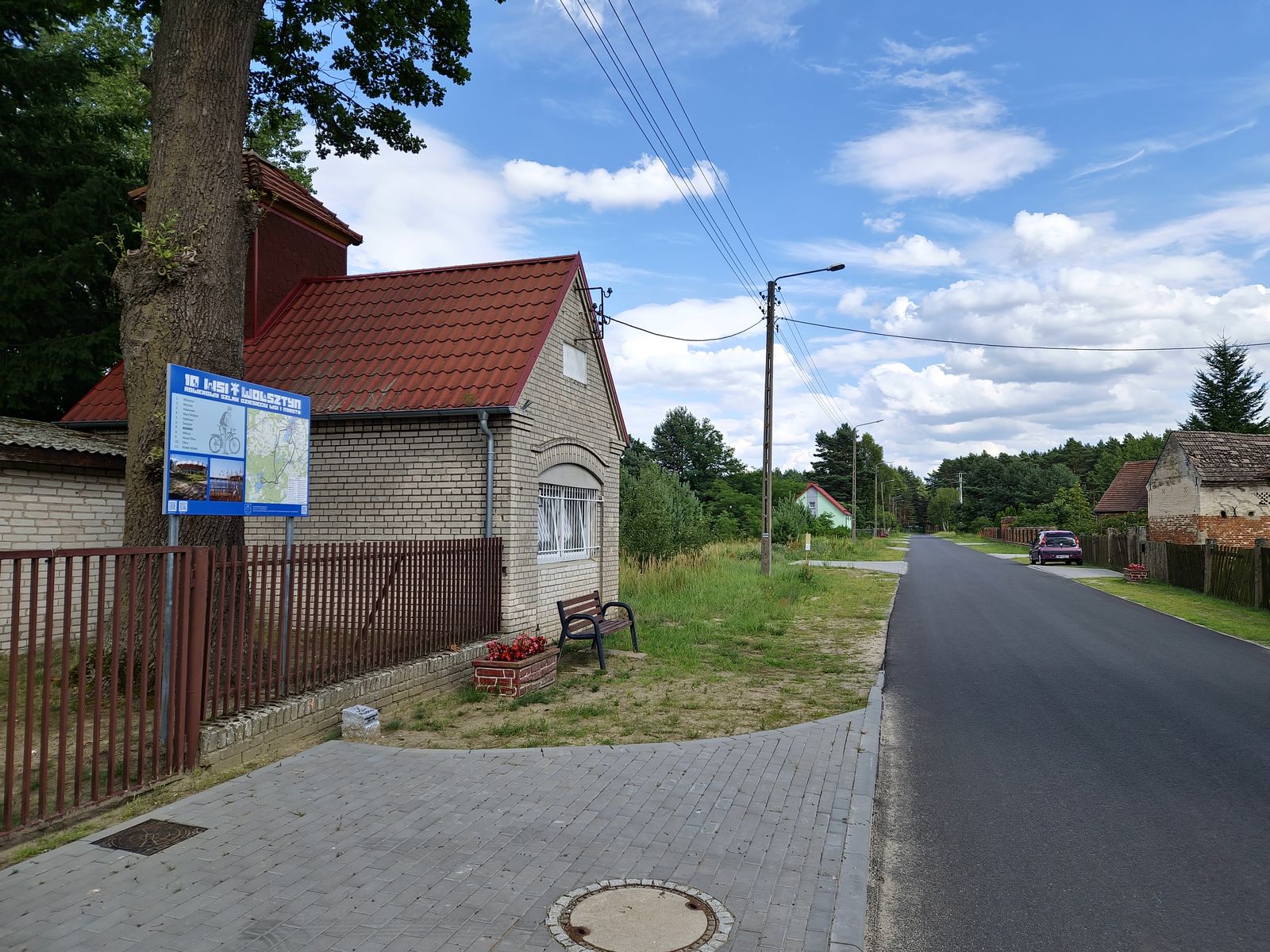 Następnie zaraz za kościołem skręcamy w prawo w ul. Cmentarną i po ok. 200 m dojedziemy do sali wiejskiej, przed którą stoi tablica szlaku oraz słupek granitowy z flagą powstańczą.