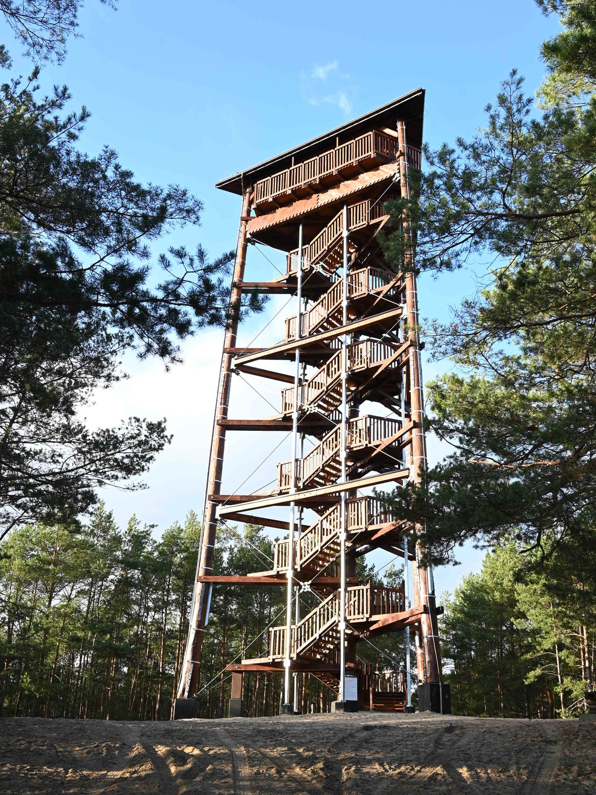 Przed drogą nr 315 ścieżka wiedzie w lewo. Po około 500 m dojedziemy do parkingu przy wieży widokowej. Znajduje się tam tablica szlaku oraz symbolem drezyny na granitowym słupku. Niecały kilometr od tego miejsca, wśród sosnowego lasu, stoi drewniana wieża widokowa (wys. 29 m), do której prowadzi leśna ścieżka.