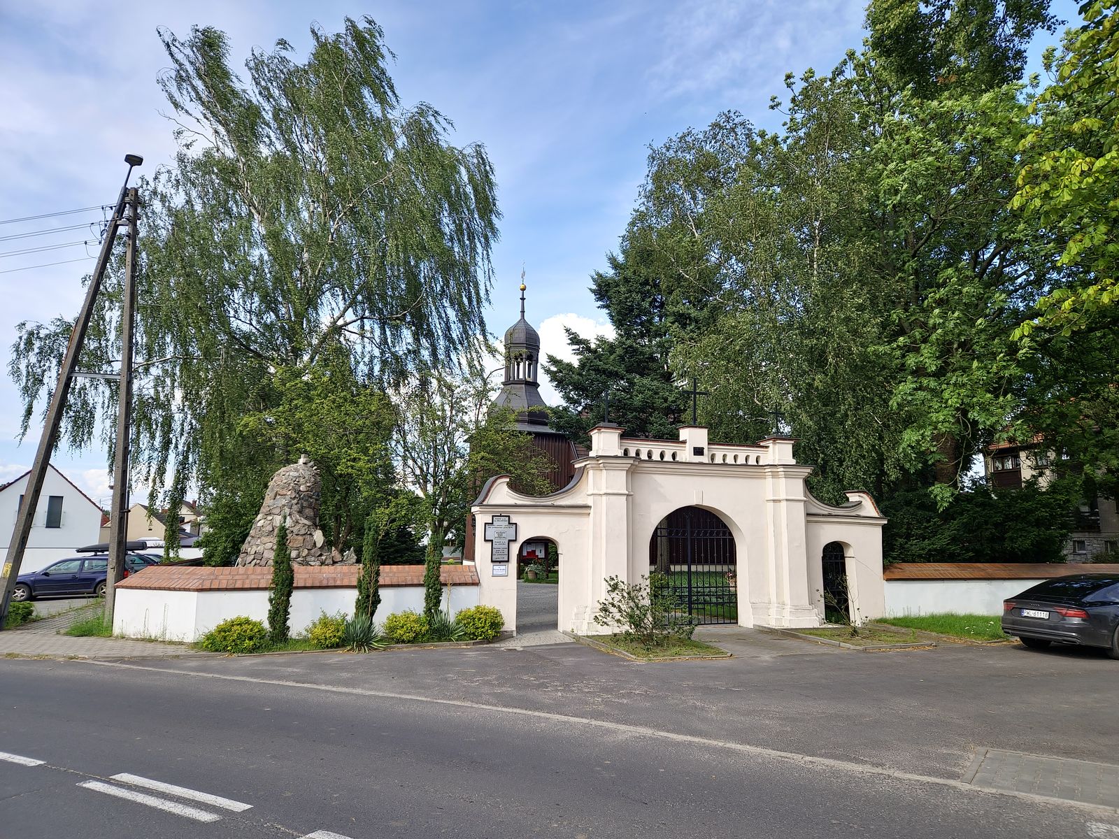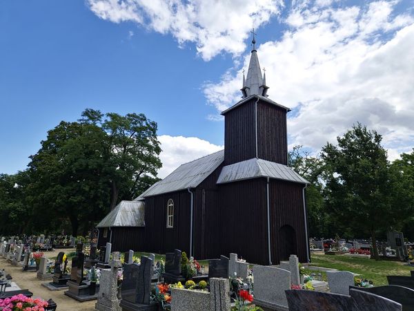 W Kębłowie na łuku drogi mijamy cmentarz i piękny drewniany Kościół św. Wawrzyńca wzniesiony w 1778 r.