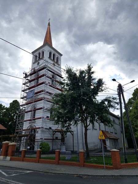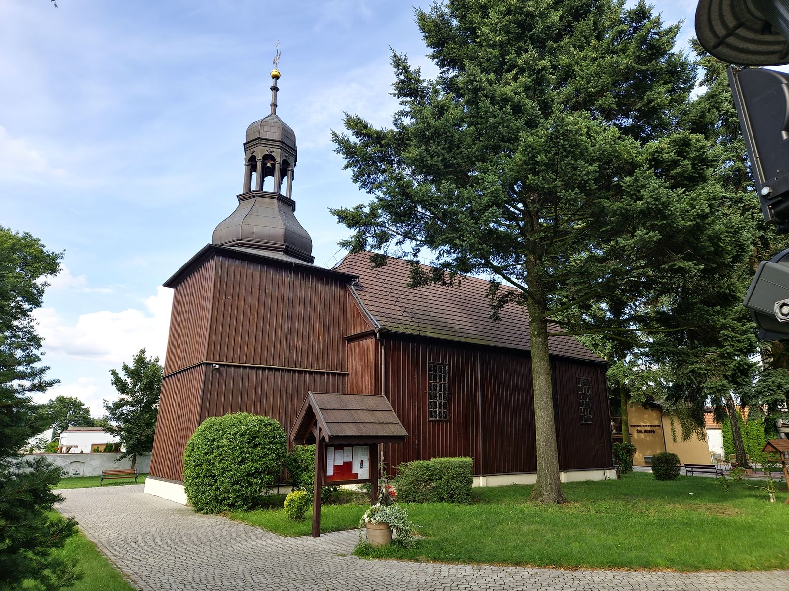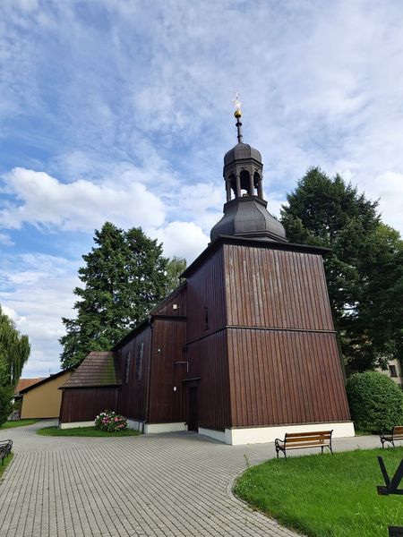 Następnie na łuku drogi skręcamy w lewo (kierunek Jażyniec). Po prawej stronie znajduje się zabytkowy, drewniany kościół św. Walentego z XVIII wieku.