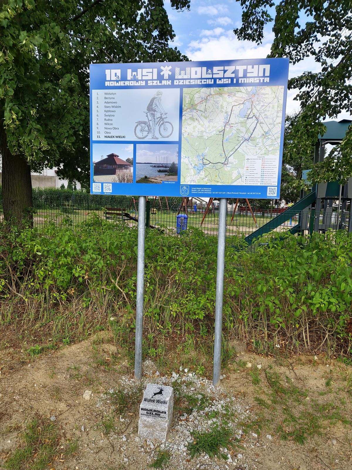 Następnie po ok. 400 m skręcamy w prawo w drugą uliczkę z kostki brukowej. Tuż przed dojazdem do drogi nr 315 skręcamy w lewo w drogę gruntową, która zaprowadzi nas do placu zabaw, przed którym stoi ostatnia tablica na naszym szlaku. Na granitowym słupku widnieje rysunek przedstawiający jelenia – symbolu dawnych właścicieli wsi, rodu Jeleni Niałków.