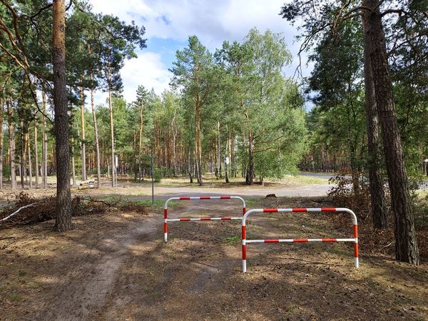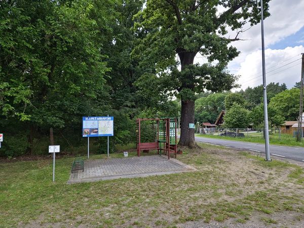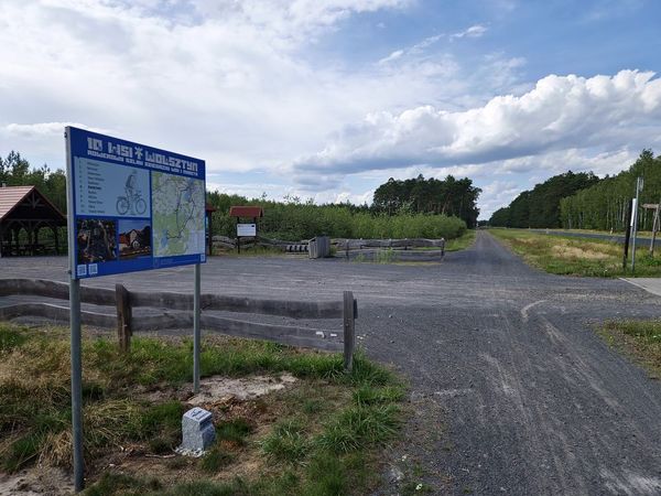 Tuż za Wilczem po lewej stronie wjeżdżamy na leśną ścieżkę rowerową. Na jej początku znajdziemy parking z wiatą i tablicami edukacyjnymi.