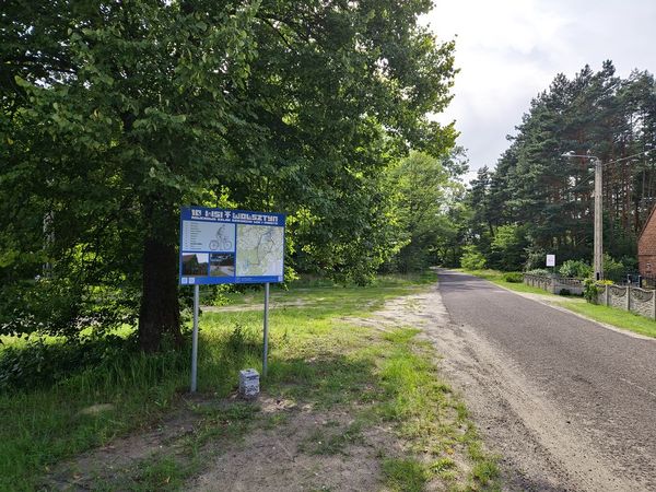 Skręcamy tam w lewo i jedziemy ok. 1 km, by dotrzeć do kolejnej tablicy oraz słupka z symbolem grzybka. Tereny leśne wokół wsi zachęcają do grzybobrania.