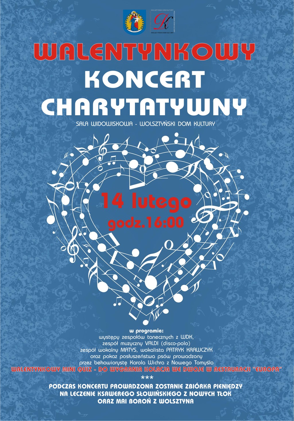 Zapraszamy na Koncert Walentynkowy. Zakochani mogą wziąść udział w mini quizie i wygrać kolację dla dwojga w restauracji "Europa".