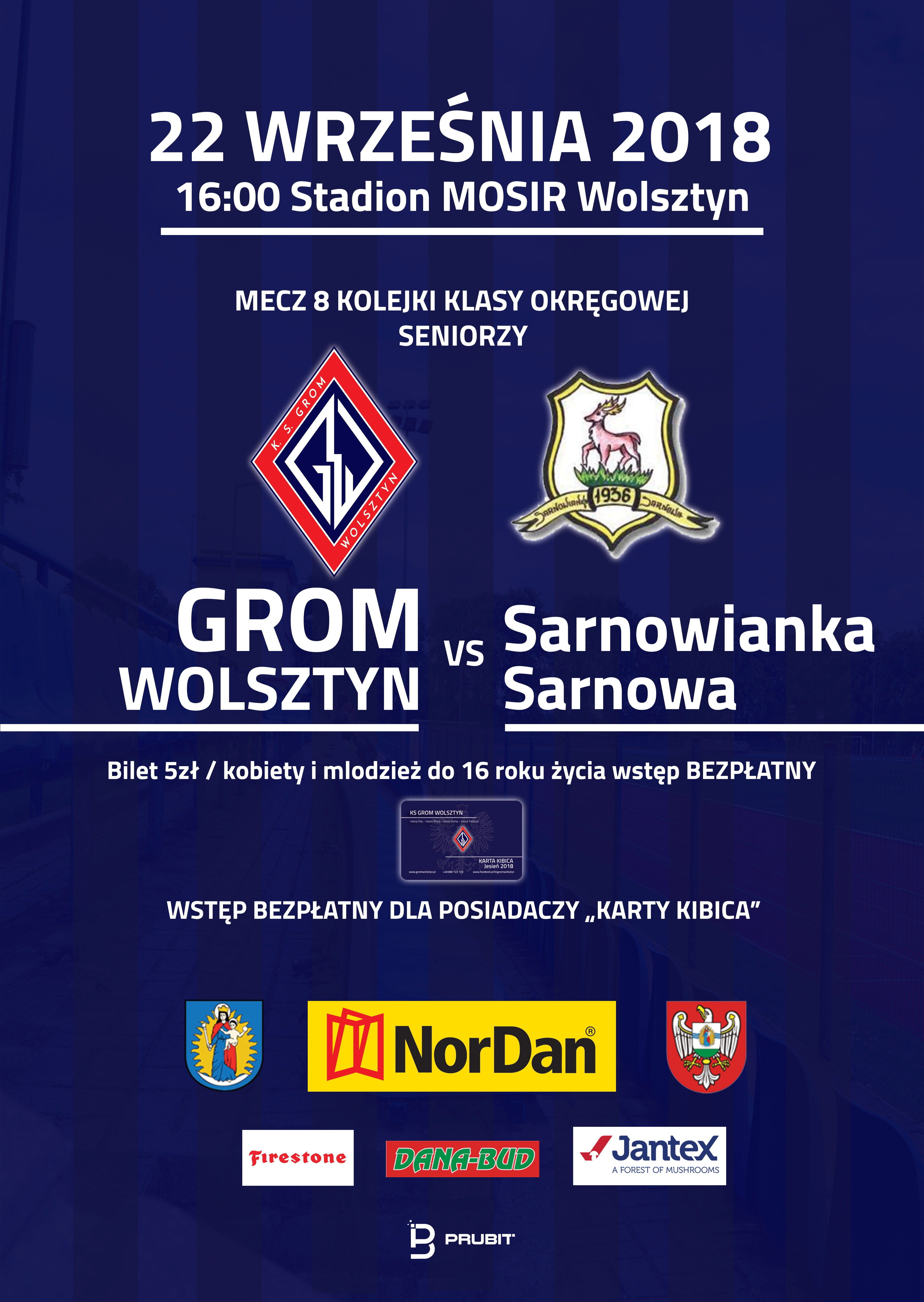 Zapraszamy na mecz 8 kolejki klasy okręgowej na Miejski stadion MOSIR. Już 22 września (sobota) KS GROM WOLSZTYN zmierzy się z drużyną Sarnowianka Sarnowa. Pierwszy gwizdek o godzinie 16:00.